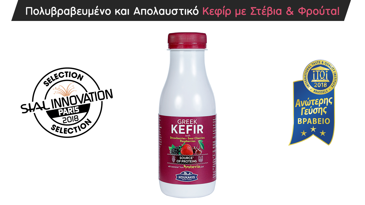 Αυτή είναι η τρίτη κατά σειρά διάκριση για το Κεφίρ με Στέβια & Κόκκινα Φρούτα, μετά την βράβευση από το κορυφαίο Ινστιτούτο Γεύσης & Ποιότητας iTQi τον Ιούνιο 2018 με 3 χρυσά αστέρια (Exceptional taste – επιτυγχάνοντας γενική βαθμολογία πάνω από 90%) και την βράβευση στην διεθνή έκθεση τροφίμων Anuga στην Κολωνία τον Οκτώβριο του 2017 και συμμετοχή στο Taste Innovation Show ως ένα από τα πιο καινοτόμα Ευρωπαϊκά νέα προϊόντα.